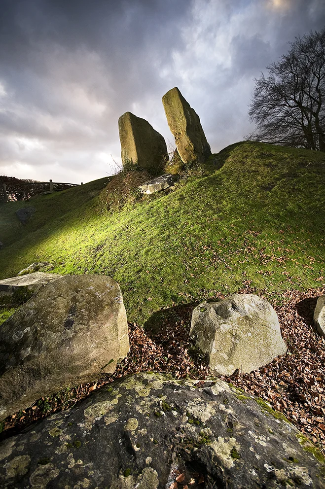 I’d been meaning to visit Coldrum for what seemed like an eternity. It would pop into my head as I was lurching around the M25 after a hard days slog in London, but usually I’d find myself too tired, the light would be fading or the weather not quite right. So despite the on/off rain showers my wife Alison and I decided to try a visit on the way to friends in North Kent and, as it turned out, it couldn’t have been much better. I was a bit surprised once we’d located it that it wasn’t perched on the edge of the North Downs, which is how I’d always pictured it, but nestling in the valley below on a small raised platform of a hill. The views from here, however, are quite wonderful as your gaze tumbles along the bottom of the downs and across the surrounding fields and I doubt whether that view will have changed very much in the past 5000 years considering it’s isolation. Somebody else who turned up while we were there informed us that most of the surrounding land is to become a vineyard in the near future and I wondered how that might impact on the site.